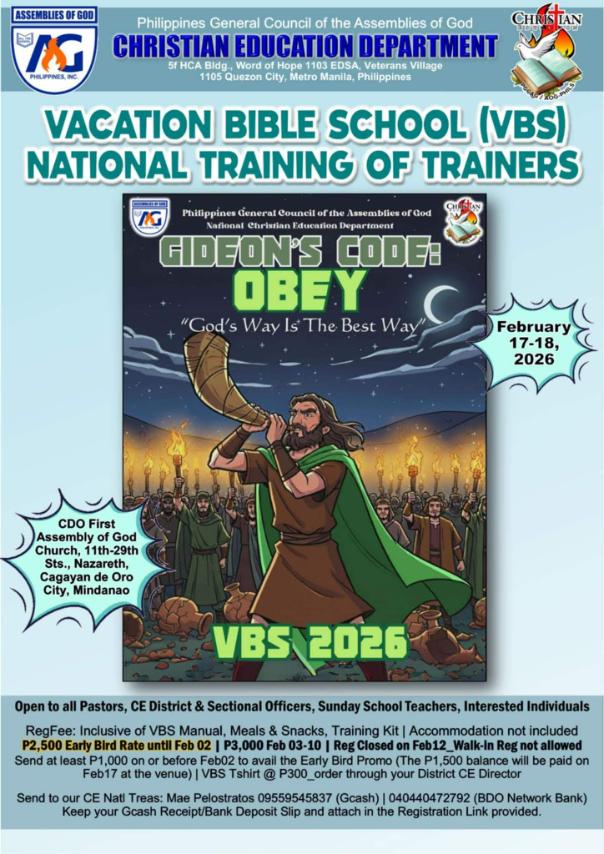 Join our Vacation Bible School—a fun, engaging, and spiritually enriching training designed for those passionate about teaching and guiding the next generation. Open to all Pastors, CE District and Sectional Officers, Sunday School Teachers, and interested individuals, this event equips participants with creative tools, biblical insights, and practical strategies for effective ministry. Be part of a meaningful experience as we grow together in faith, learning, and service!